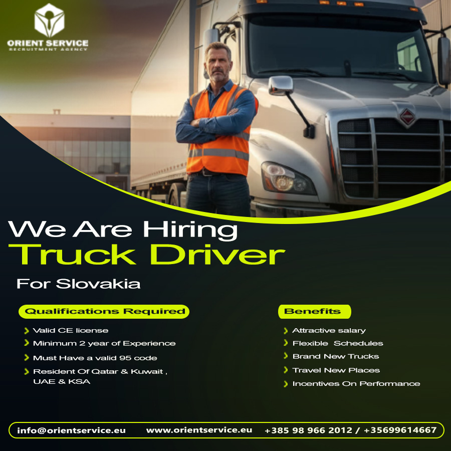 Are you an experienced truck driver ready to take your career to the next level? Orient Service Recruitment Agency is now hiring professional CE truck drivers for Slovakia, one of Europe’s fastest-growing logistics hubs. With a high demand for qualified international drivers, this is your opportunity to secure a stable, high-paying driving job abroad with excellent working conditions, modern vehicles, and long-term career growth.